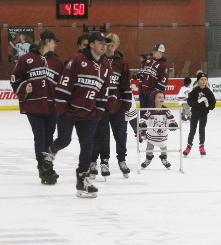 Photo by Samantha Davis Fairbanks Ice Dogs hockey players host an open skate session with local children on Thursday.