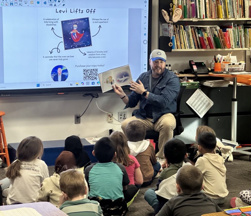 - Photos by Samantha Davis: Daniel Bot, former Marshall resident and Southwest Minnesota State University graduate, reads his published book, ‘Levi Lifts Off,’ to a Park Side Elementary class Monday morning. Bot also visited Holy Reedemer to share the story of his late stepson, Levi Bensen, a tribute to children living with disabilities.