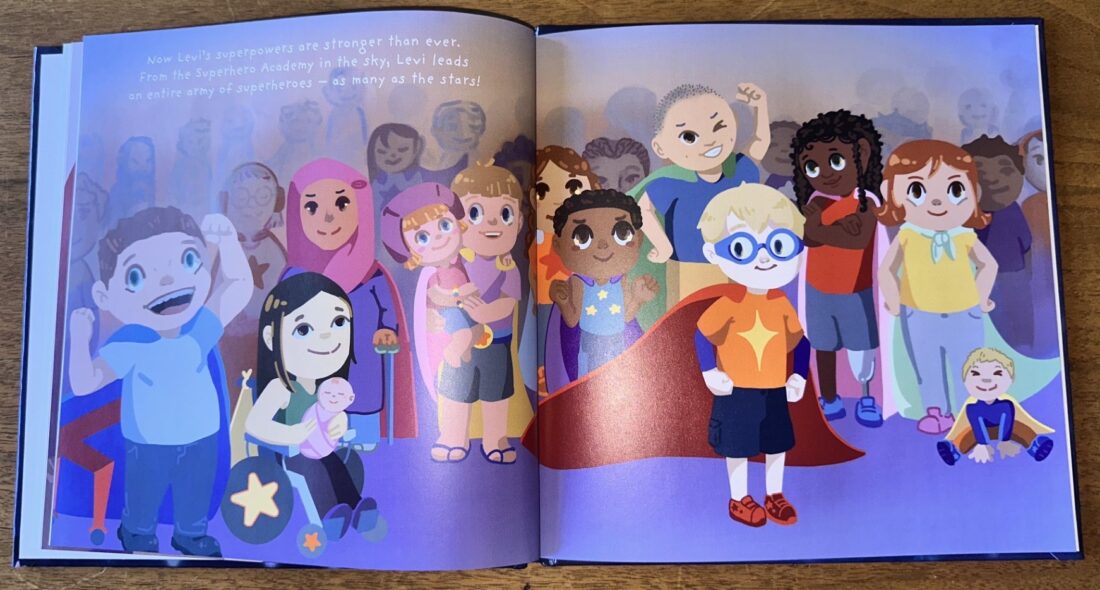 In Bot’s book acknowledgements, he also wrote a thank-you to “the entire Superhero Army,” regarding to one of the final pages in his book of Levi surrounded by other children with superhero capes, “For sharing your wisdom and your precious, fleeting moments with us before lifting off to protect us from above.”