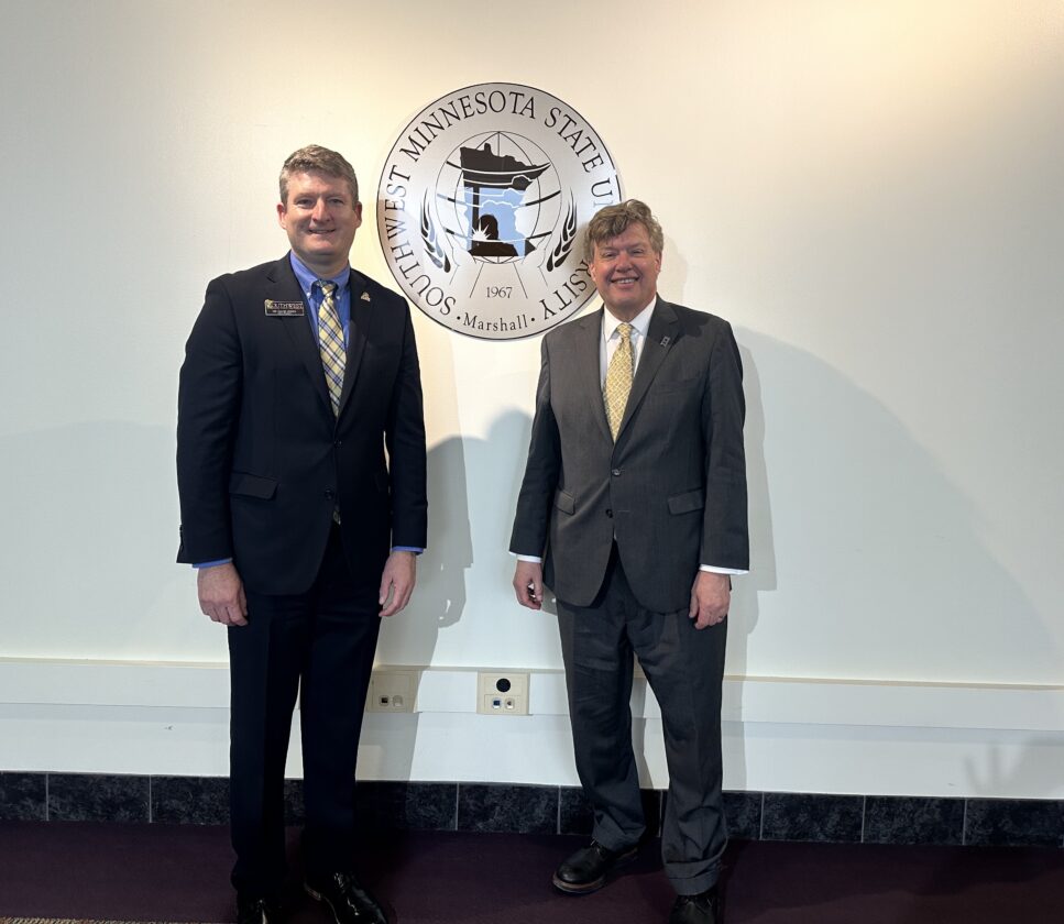Southwest Minnesota State University president Dr. David Jones (left) stands with Minnesota State Chancellor Scott Olson (right) Thursday afternoon after Jones was announced as SMSU's new president on Wednesday.