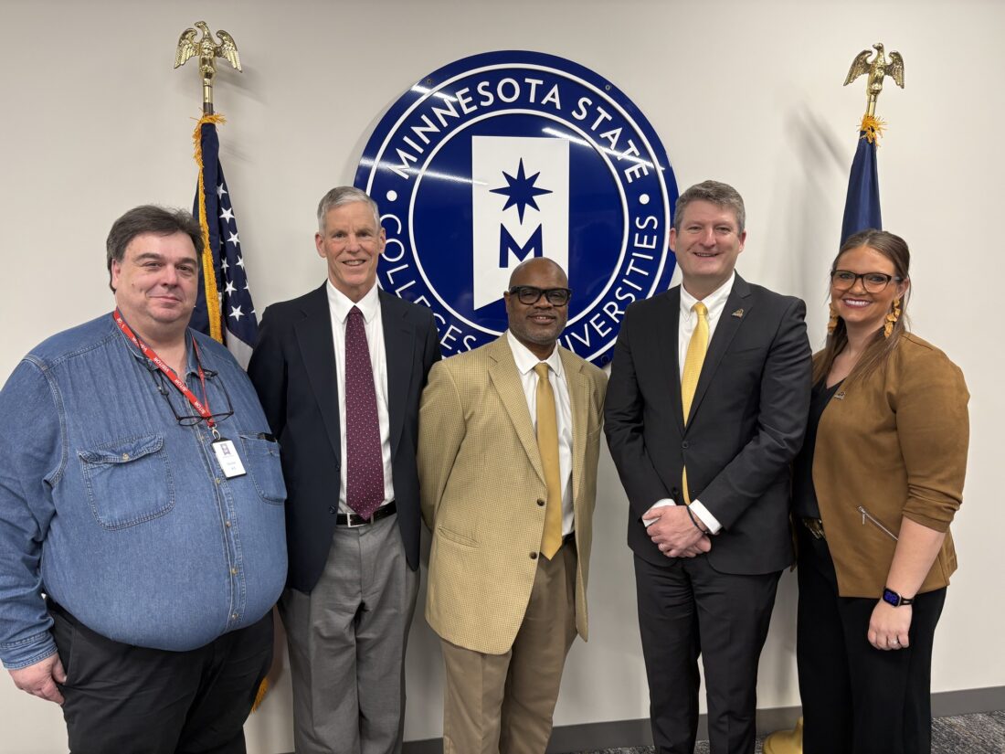 - Photo courtesy of Southwest Minnesota State University: Dr. David Jones (second from right) stands with fellow SMSU representatives (left to right) Tim Beske, Ross Wastvedt, Jay Lee and Laura O’Rourke Wednesday afternoon at the Minnesota State system office after being announced as SMSU’s new permanent president.