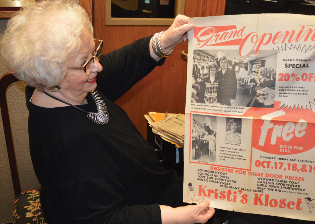 Photo by Deb Gau Sandy Miller holds up a newspaper ad for the grand opening of their family’s business, Kristi’s Kloset, back in 1974. The ad included pictures of Sandy and Lu, and their daughter Kristi, for whom the store was named.