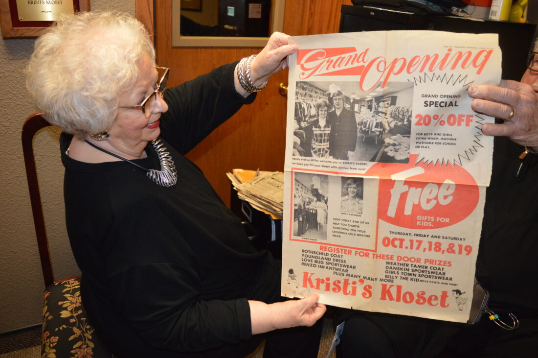 Sandy Miller and Lu Miller held up a newspaper ad for the grand opening of their family’s business, Kristi’s Kloset, back in 1974. The ad included pictures of Sandy and Lu, and their daughter Kristi, for whom the store was named. The store, now called Kristi’s For Women, will be closing after 52 years in business.