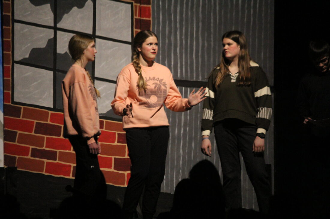 Photo by Samantha Davis: True Light Christian School students Reese Livingston (left), Kyla Sprik (middle) and Ora Knochenmus (right) perform in the school’s annual theater show Wednesday afternoon, which is open to the public Thursday and Friday night with dinner to take place beforehand.