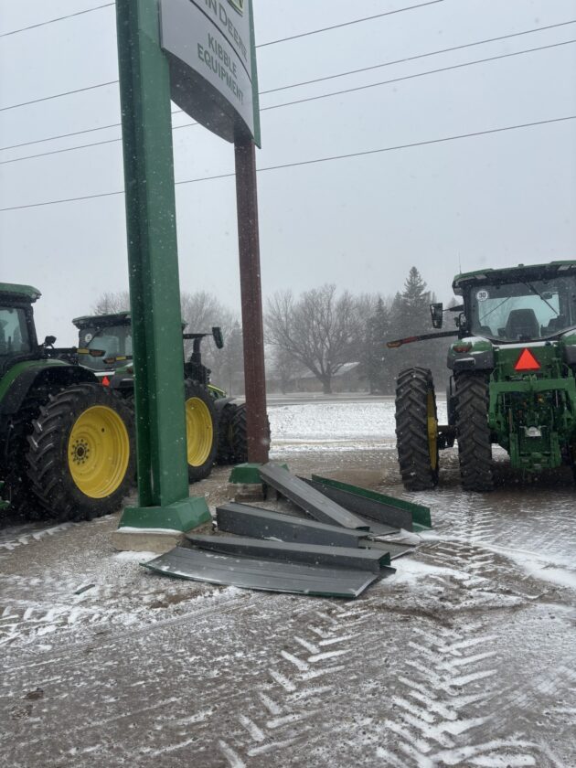 Photo courtesy of Jarret Beebout High winds on Wednesday caused some damage to a sign outside Kibble Equipment in Marshall. Blowing snow cut down visibility on Wednesday, and led to no-travel advisories affecting several area highways.