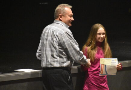 Photo by Samantha Davis: Marshall sixth grade student Isabel Christiansen recieves her second-place award for the 4-Way essay contest from rotary president Tony Thiesen Thursday afternoon.