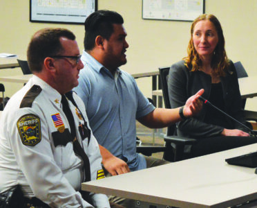 Photo by Deb Gau Lyon County Sheriff Eric Wallen, and Jory Dove and Sarah Ackerman of Western Mental Health Center, spoke about a proposed partnership for a restorative competency program. The program would provide mental health services to people being held at the Lyon County Jail. Dove said people who have been found not competent to stand trial may have to wait a long time in jail before they can get inpatient mental health care.