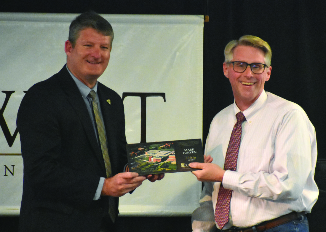 - Photo by Samantha Davis: Southwest Minnesota State University’s Mark Fokken (right) receives an award from President Dr. David Jones (left) after being recognized at the employee milestone ceremony Wednesday evening.