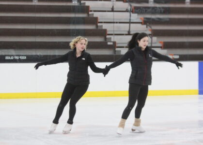 Photo by Samantha Davis: Southwest Figure Skating Club skaters and coaches Miranda Doose (left) and Mikayla Chesley (right) practice their duet for the upcoming annual ice show. The skating club will host its 30th anniversary show on March 14 at the Red Baron Arena at 12 p.m. and 7 p.m.