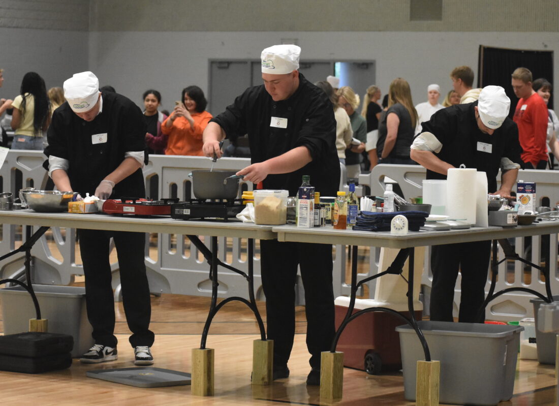 Photo by Samantha Davis: Russell-Tyler-Ruthton students Juhl Drake (left), Brice Roelofs (middle) and Kolby Louwagie (right) work together during the cooking competition at the Southwest West Central Service Cooperative’s annual culinary skills challenge on Thursday in Marshall.