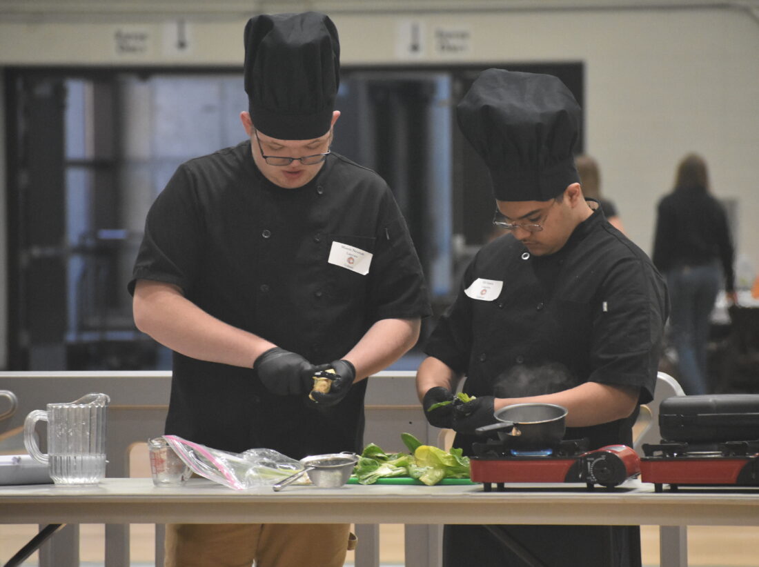 Photo by Samantha Davis: Lakeview students Mason Neuman (left) and Eli Garcia (right) work together during the cooking competition at the Southwest West Central Service Cooperative’s annual culinary skills challenge on Thursday in Marshall.