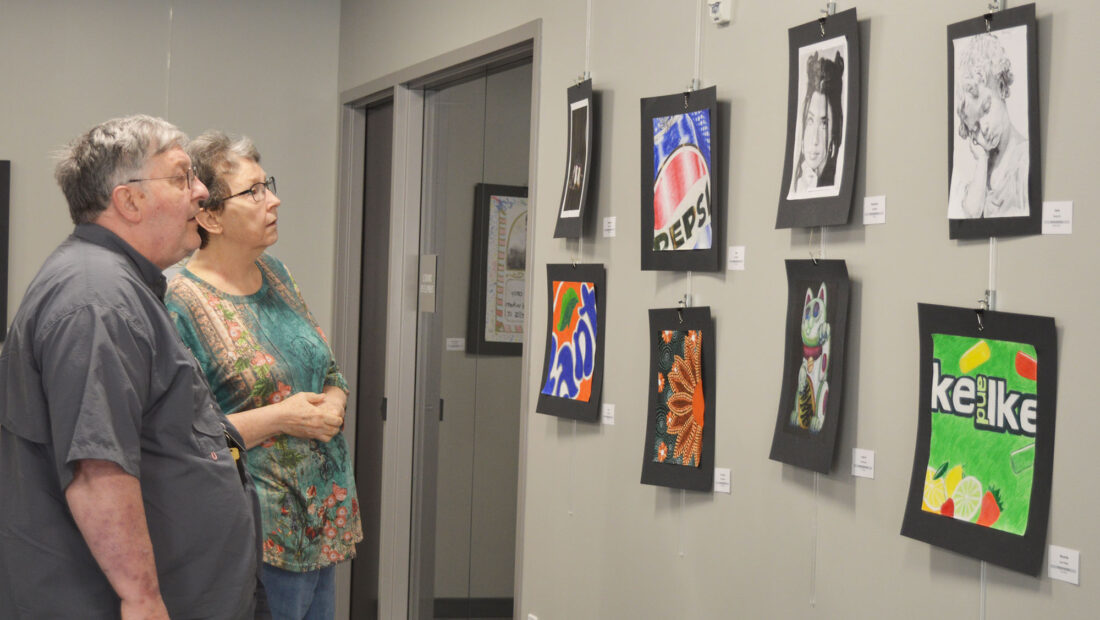 Photo by Deb Gau Visitors came to see artwork by Marshall, Minneota and Russell-Tyler-Ruthton High School students, at the ongoing High School Art Stars exhibit at Marshall City Hall.