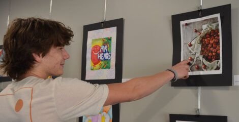 Photo by Deb Gau Marshall High School student Ayden Keen pointed out the details of one of his artworks in the show. Keen had cut out a circle from part of a photograph, and then painted in the missing part of the image.