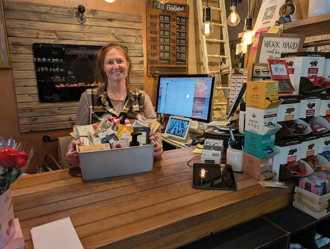 Photo by Mike Lamb Melissa Syring shows off a gift basket inside the Falls Boutique in Granite Falls.