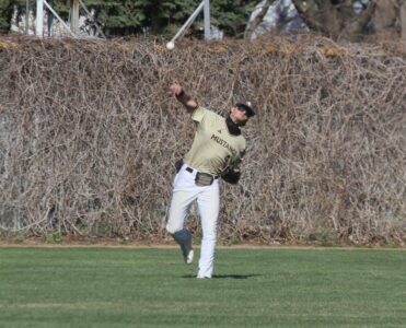 - Photo by Samantha Davis: Southwest Minnesota State University’s Henry Hammrich throws the ball in from center field after fielding the ball in the second game of a three-game series against University of Jamestown on Sunday in Marshall.