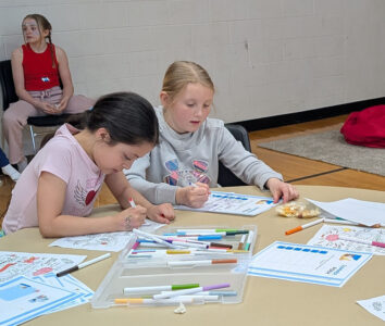 - Photo by Mike Lamb Yaretzi Estaresparza, left, and Sutton Schwartzwork on some art work during the Healthy Kids Day at the Marshall Area YMCA Saturday.
