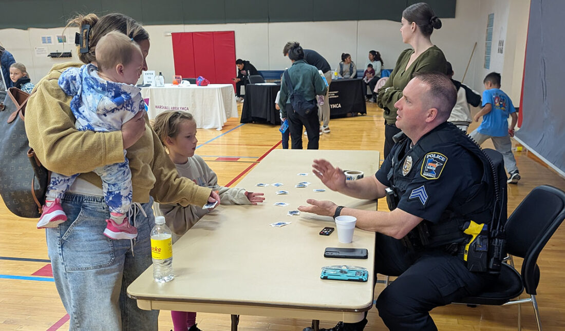 - Photo by Mike Lamb Marshall Police Department Sgt. Ben Rieke talks with a mother and her two children during the Healthy Kids Day at the Marshall Area YMCA Saturday.