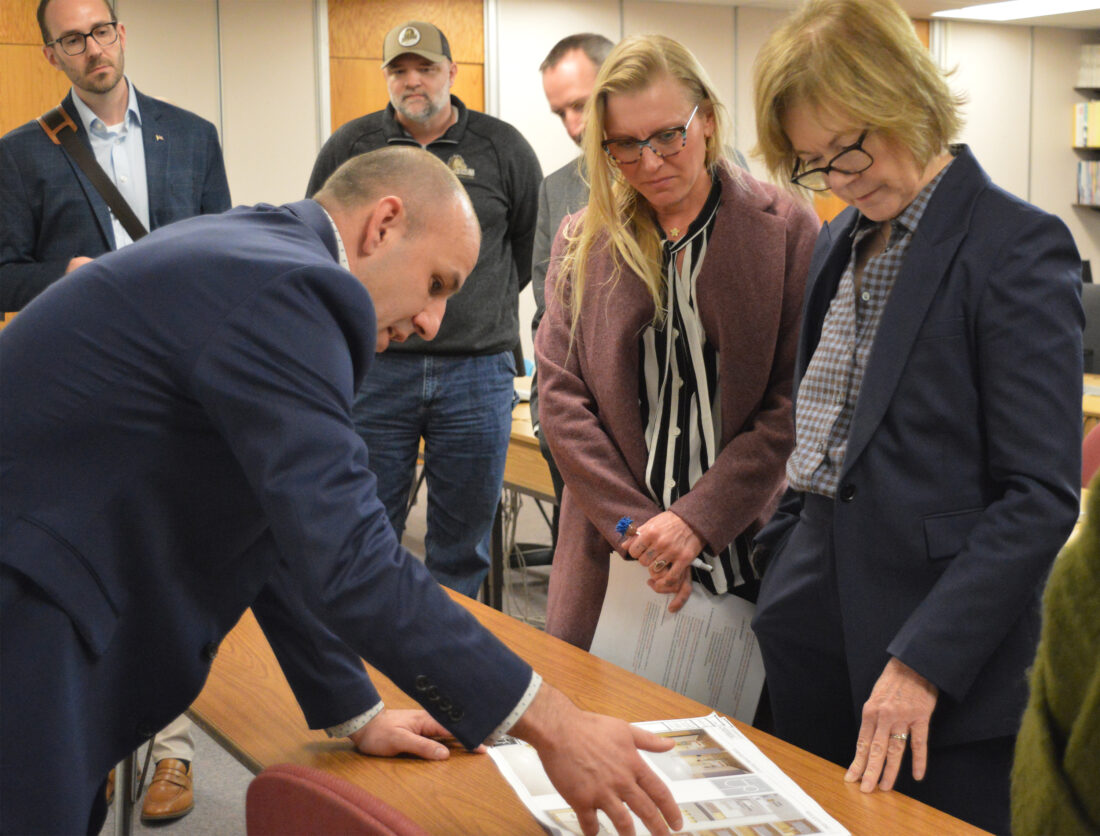 Photo by Deb Gau U.S. Sen Tina Smith looked over design documents for planned lab space for a four-year nursing program at Southwest Minnesota State University. Smith met with SMSU officials, Todd Squires of designArc Group, and associate professor of nursing Dr. Lindsay Pelz.