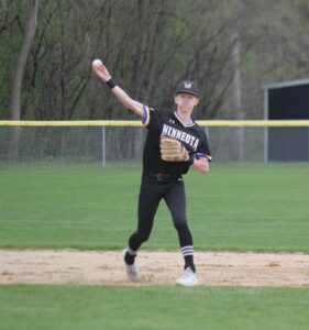 Photo by Samantha Davis: Minneota shortstop Ian Myhre throws to first base against Russell-Tyler-Ruthton Tuesday night.