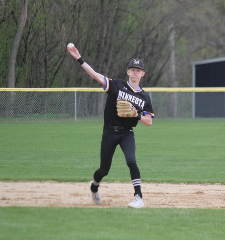 Photo by Samantha Davis: Minneota third baseman Creed Stassen throws to first base for an out against Russell-Tyler-Ruthton Tuesday night.