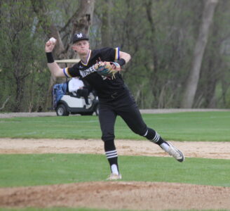 - Photo by Samantha Davis: Minneota’s Mason Javers throws a pitch against Russell-Tyler-Ruthton Tuesday night. The Vikings defeated the Knights 2-0, behind Javers’ 13 strikeouts.
