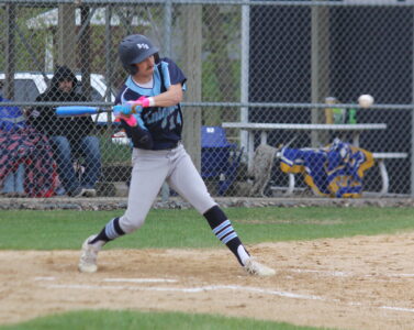 - Photo by Samantha Davis: Minneota’s Carson Javers connects for a hit against Russell-Tyler-Ruthton Tuesday night.
