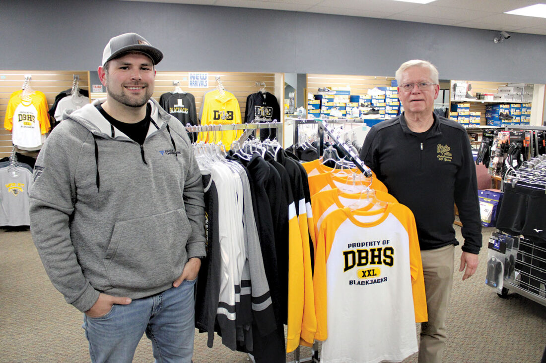 Photo by Jim Tate Jordan Tollakson, left, is the owner of Jim’s Clothing and Sporting Goods in Dawson, having purchased the business from Jim Prestholdt, right.