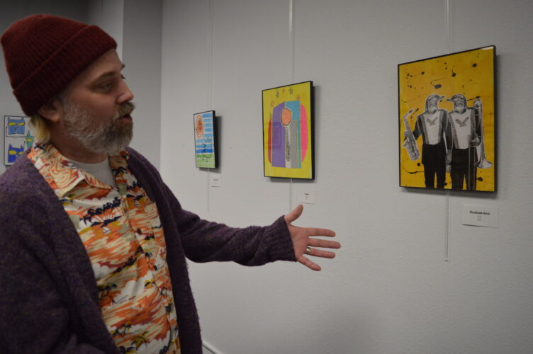 MARSHALL — The artworks Oak Kelsey has on display at the Marshall Area Fine Arts Council gallery use a variety of different techniques, from collage and chalk drawing to painting with stencils. But there are some threads that tie them all together, Kelsey said Thursday.