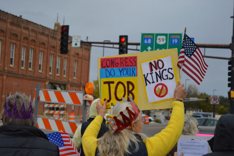 MARSHALL — A crowd of about 300 people gathered in downtown Marshall on Saturday, as “No Kings” demonstrations were held in communities around Minnesota. Protesters held handmade signs as they lined the sidewalk in front of Memorial Park on Main Street.