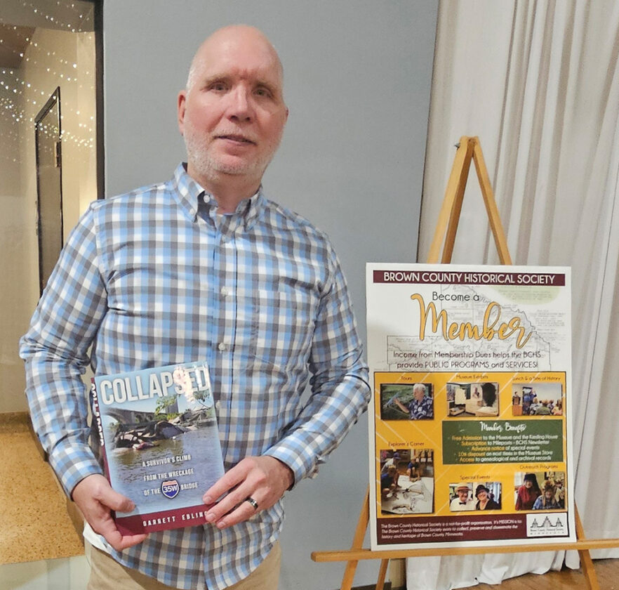 Photo by Amy Zents Garrett Ebling holds a copy of “Collapsed,” his memoir recounting survival and recovery after the I-35W bridge collapse during the Brown County Historical Society’s annual gathering.