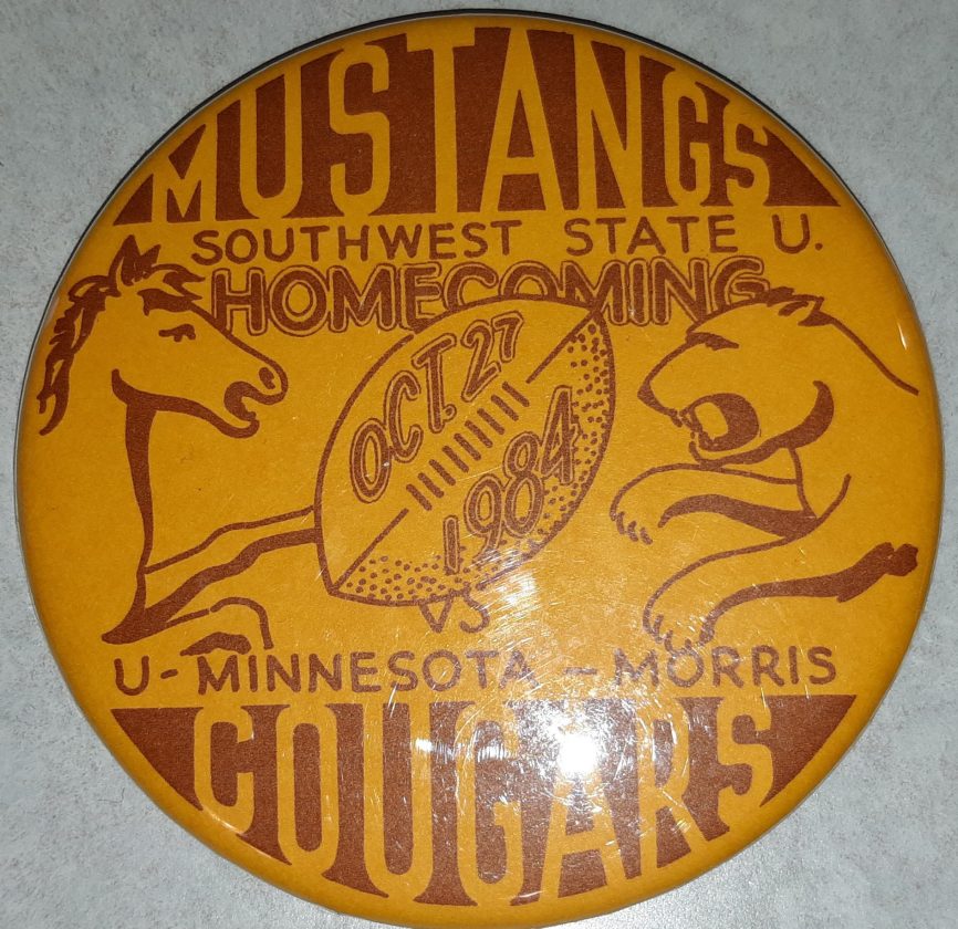 The photograph featured this week shows a picture of a Homecoming pin from the Lyon County Museum’s collection. The pin is from Southwest State University’s Homecoming in 1984. The Mustangs football team played the University of Minnesota Morris Cougars.