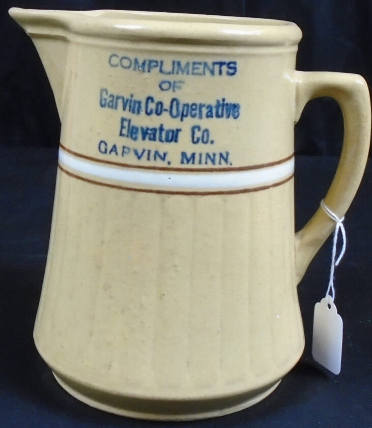 Tan ceramic pitcher with "Complements of Garvin Co-operative Elevator Co. Garvin, Minn." printed on the side in black.