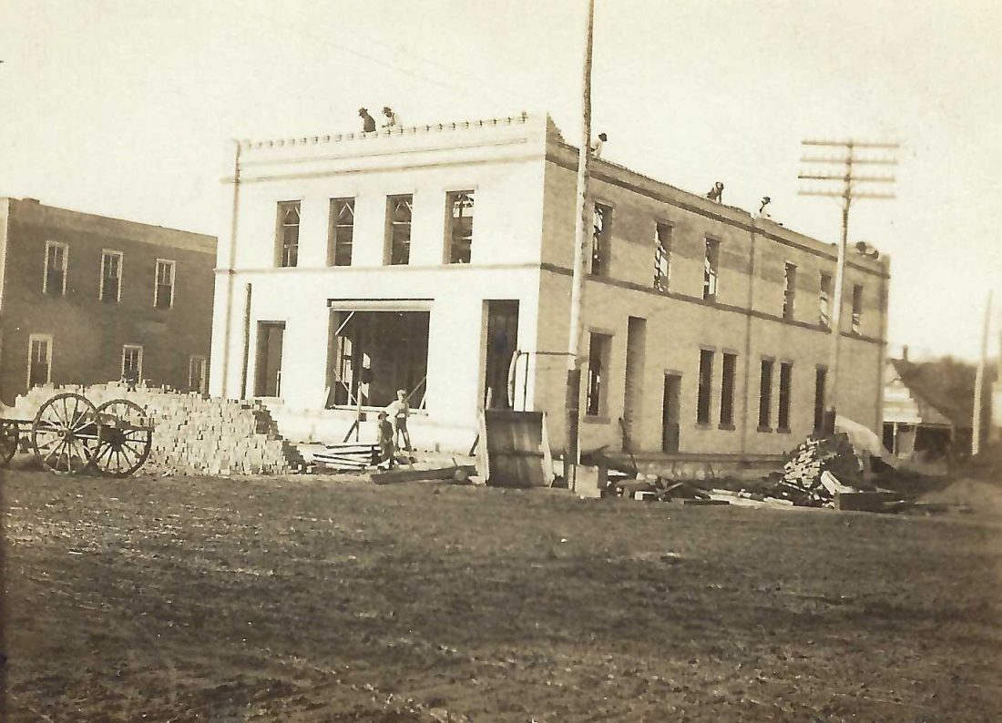 The photograph featured this week from the Lyon County Museum’s collection shows construction in May of 1909 on the Marshall Creamery Company building on the corner of Main and 4th Streets. In 1919, Matt Langenfeld and Matt Neisen became proprietors of the business. In 1923, they sold the butter making portion of the business to the Producer’s Co-operative Creamery but retained their ice cream business, the Marshall Ice Cream Company, in a new plant on S. 4th. The creamery building along with the Central Hotel next to it were torn down in 1963 to make way for First National Bank’s new building. Today, this building is home to Wells Fargo.