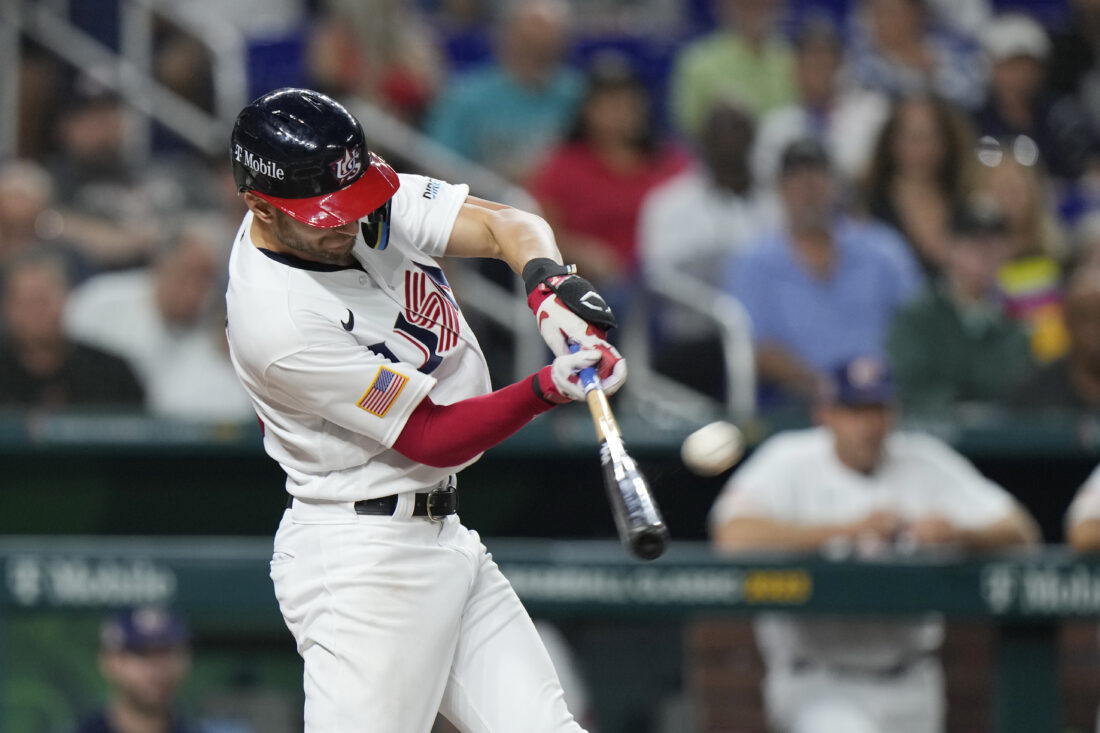 United States' Trea Turner hits a home run during the second inning of a World Baseball Classic game against Cuba, Sunday, March 19, 2023, in Miami. (AP Photo/Wilfredo Lee)