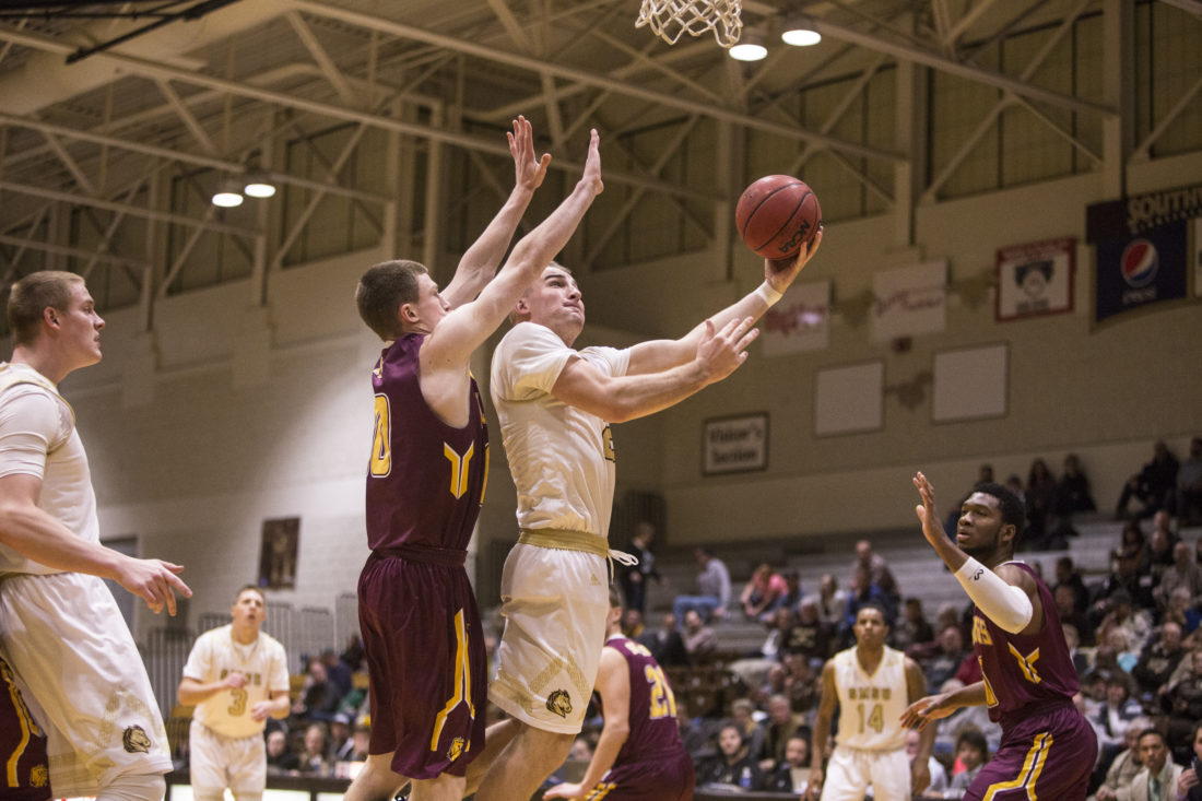 Photo by Sam Thiel SMSU’s Turner Moen goes up for the layup during the Mustangs’ game against the University of Minnesota Duluth Bulldogs on Friday night.