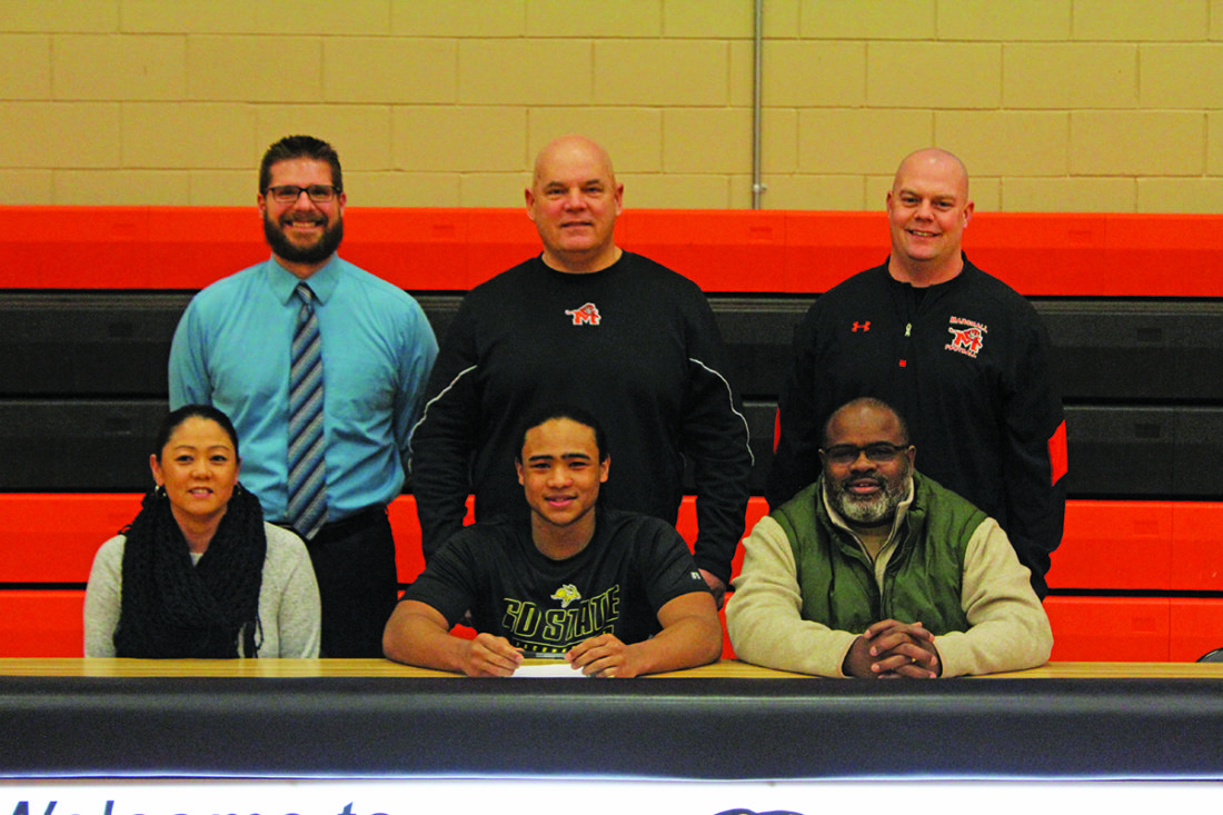 Photo by Sam Thiel Marshall’s Jefferson Lee V, along with his parents and coaches, poses for a photo after Lee V signs his National Letter of Intent to play football at South Dakota State University on Wednesday morning.