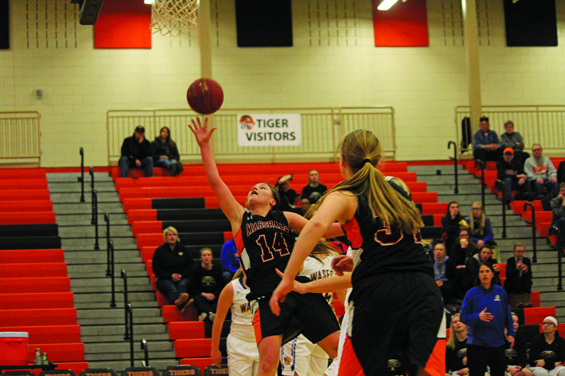 Photo by Sam Thiel Marshall’s Jordyn Hilgemann puts up a shot during their game against Waseca on Friday. The Tigers fell to the Bluejays 54-37.