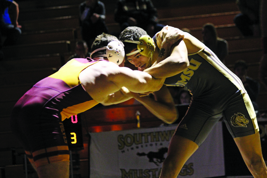 Independent file photo SMSU’s Cortez Arredondo fights for control with his Northern State University opponent during their Jan. 19 match. Arredondo will be competing at the NCAA Division II Wrestling Championships this weekend.