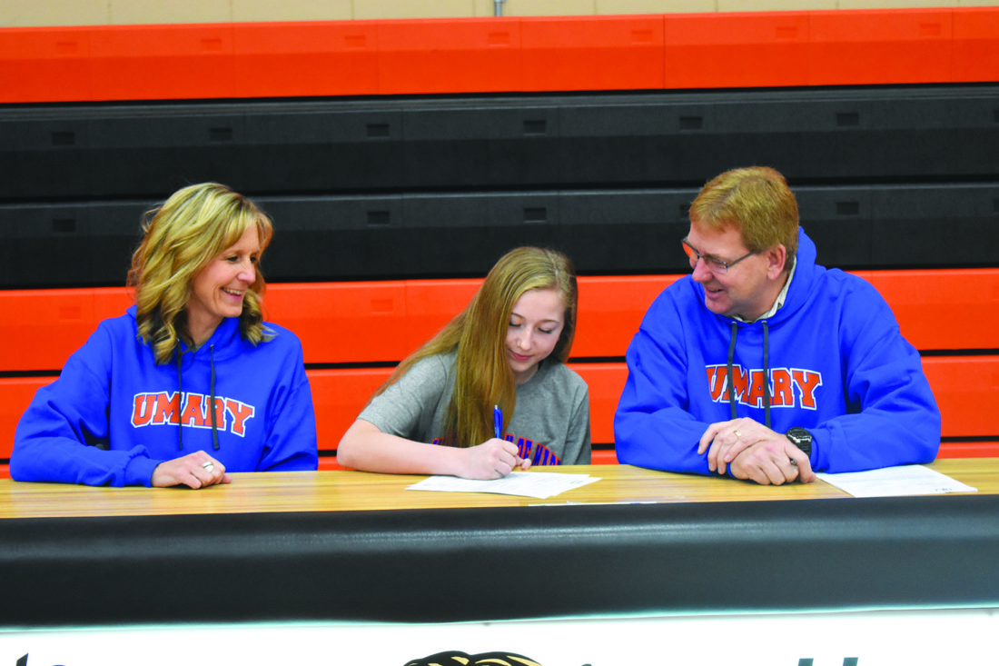 Surrounded by their family, friends, teammates and coaches, seniors Olivia Peterson and Kaia Sueker both signed their National Letters of Intent in the high school gymnasium, with Peterson playing golf at St. Cloud State University and Sueker competing in cross country and track and field at the University of Mary.