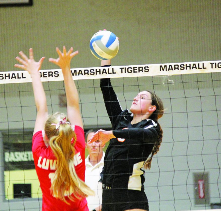 Photo by Jake Przytarski Marshall’s Bria Morris rises up for a kill during their match against Luverne on Tuesday. The Tigers defeated the Cardinals 3-0.