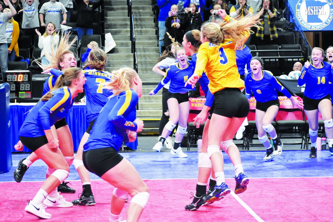 Members of the Minneota volleyball team celebrate after defeating Waterville-Elysian-Morristown in the Class A championship on Saturday at Xcel Energy Center. The Vikings won 3-0 for their second straight title and third overall.
