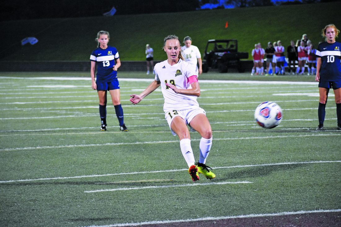 Independent file photo SMSU’s Kelli Wentz kicks the ball during their game against Augustana University on Sept. 20. The Mustangs will face the Vikings in the NSIC Tournament today.