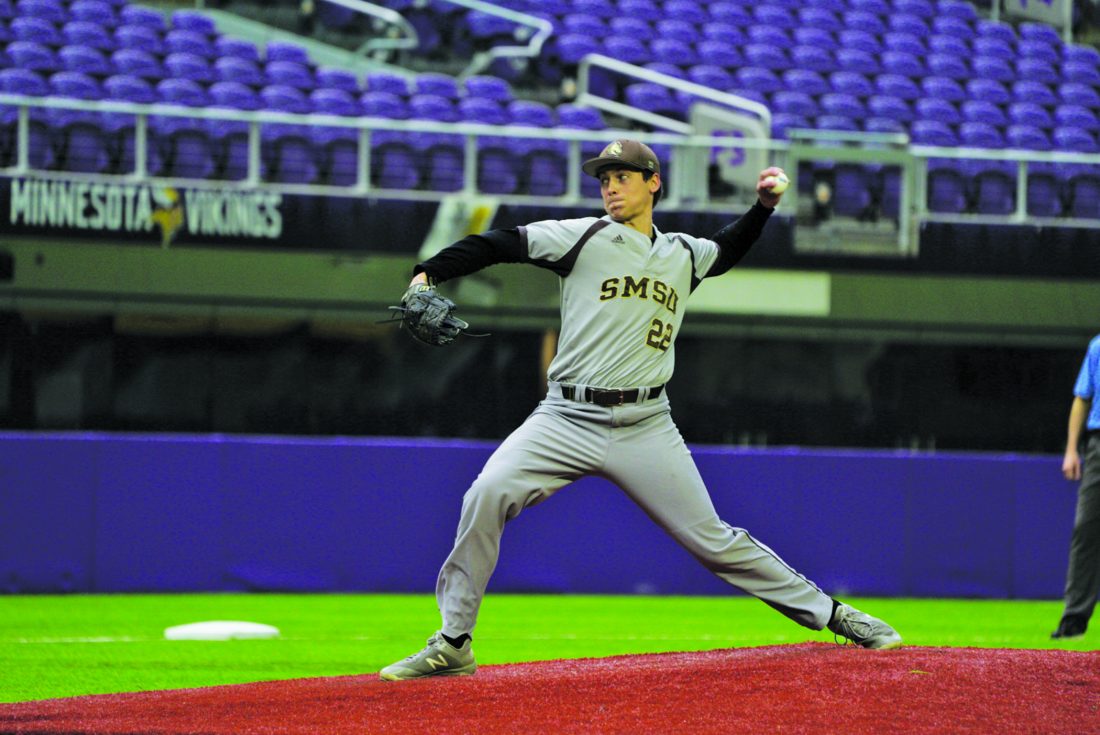 Photo courtesy of Tristen Groff SMSU’s John Bezdicek delivers a pitch during their game against the University of Minnesota Duluth on Feb. 27 at U.S. Bank Stadium.