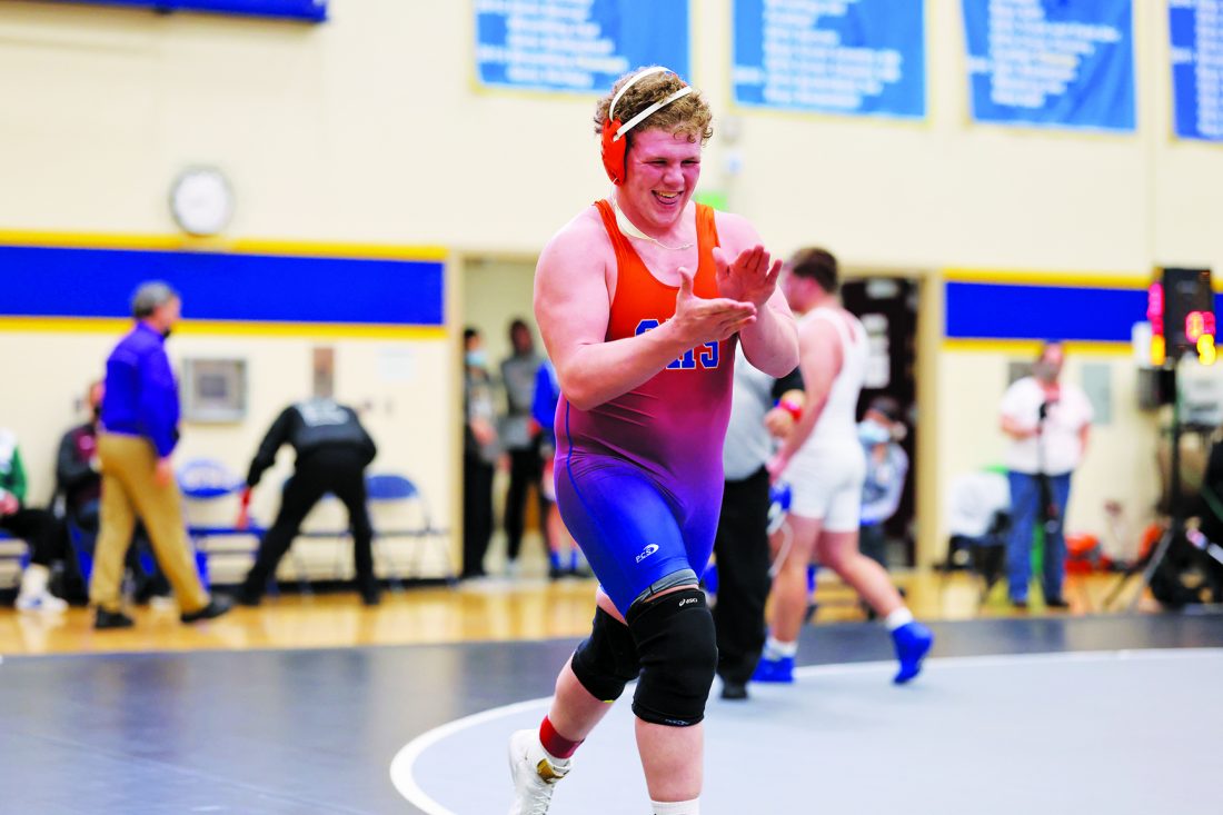 Photo courtesy of Minnesota State High School League Canby’s Shane Noyes celebrates after defeating Minnewaska Area’s Jakob Swalla in the heavyweight championship of the Class A Individual tournament on Saturday at St. Michael-Albertville High School.