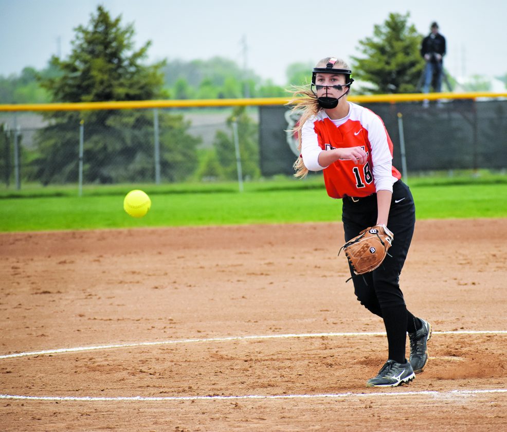 Photo by Sam Thiel Marshall’s Olivia Houseman fires a pitch during game one of their doubleheader against Willmar on Tuesday. Marshall defeated Willmar 8-1 in game one and 12-0 in five innings in game two.