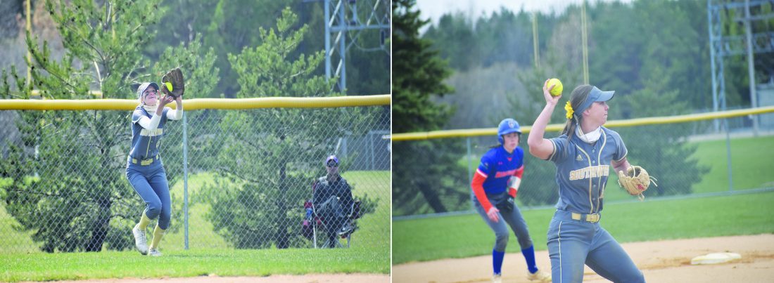 Independent file photos Left: SMSU’s Emma Grote catches a fly ball during their game against Winona State on April 11. Right: SMSU’s Kali Tomlinson throws to first during their game against the University of Mary on April 26.