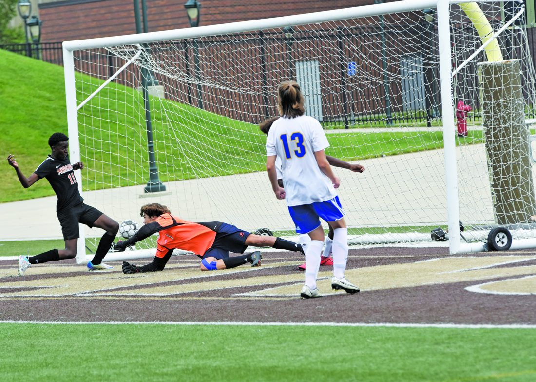 Photo by Sam Thiel Marshall’s Khalid Ismail gets the ball past the diving Waseca goalkeeper to score a goal during their game on Saturday. Marshall defeated Waseca 6-2.