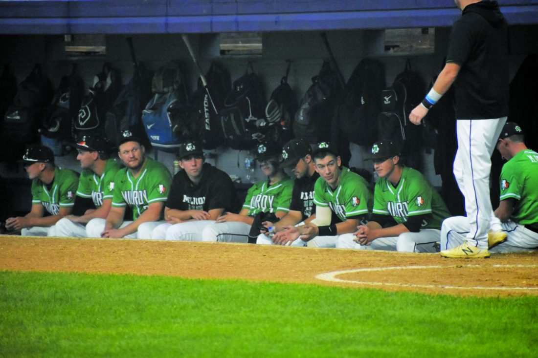 Members of the Milroy Irish wait in the dugout during a 90-minute rain delay before their scheduled Class C state tournament game against Maple Lake on Friday. The game has been postponed to Sunday night in Hamburg, with first pitch scheduled for 7 p.m.