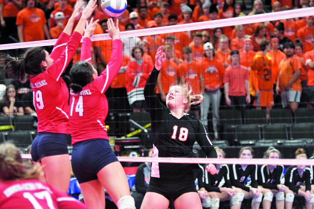 Photo by Sam Thiel Marshall’s Randi Wendorff pushes the ball over a pair of St. Paul Highland Park defenders during their Class AAA Tournament match on Wednesday at Xcel Energy Center. Marshall defeated Highland Park 3-0.