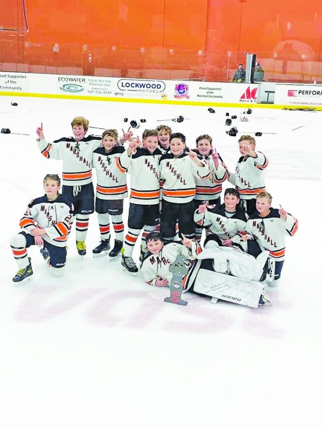Photo courtesy of MAHA Members of the Marshall Squirt A hockey team pose for a photo after taking first place at its home tournament over the weekend. Team members include: Dax Anderson, Liam Deutz, Nolan Deutz, Bennett Kimman, Cooper Zent, Ty Stelter, Brekken Parrie, Callahan Jans, Cale Erickson, Grady Hess and Brayson Ritter. Coaches are Adam Hess and Jen Kimman.